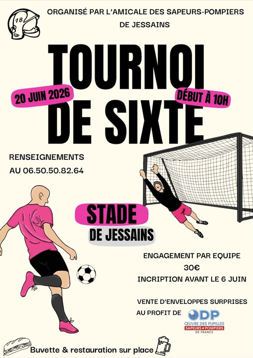 L’amicale des Sapeurs-Pompiers de Jessains organise son Tournoi de Sixte, le 20 juin 2026 à 10h00, au stade de Jessains.